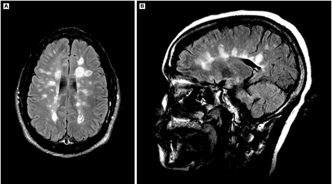 Аксиальные (A) и сагиттальные срезы (B) МРТ (FLAIR) головного мозга, на которых видны множественные овоидные перивентрикулярные очаги (пальцы Доусона) у пациента с рассеянным склерозом.